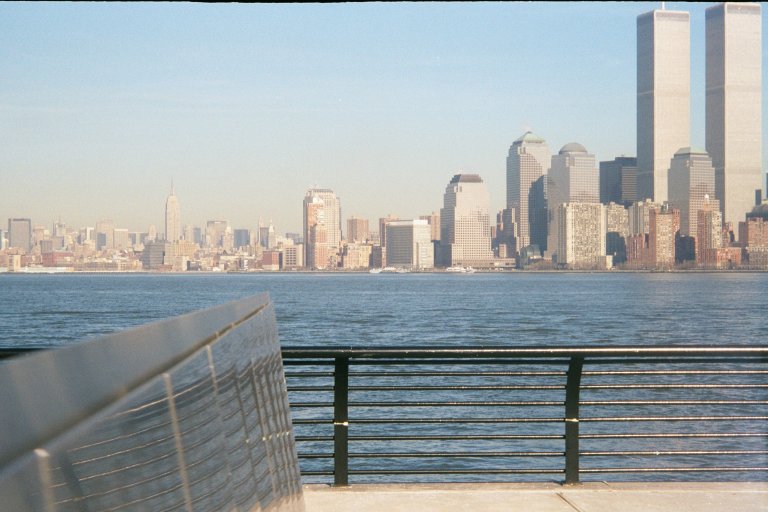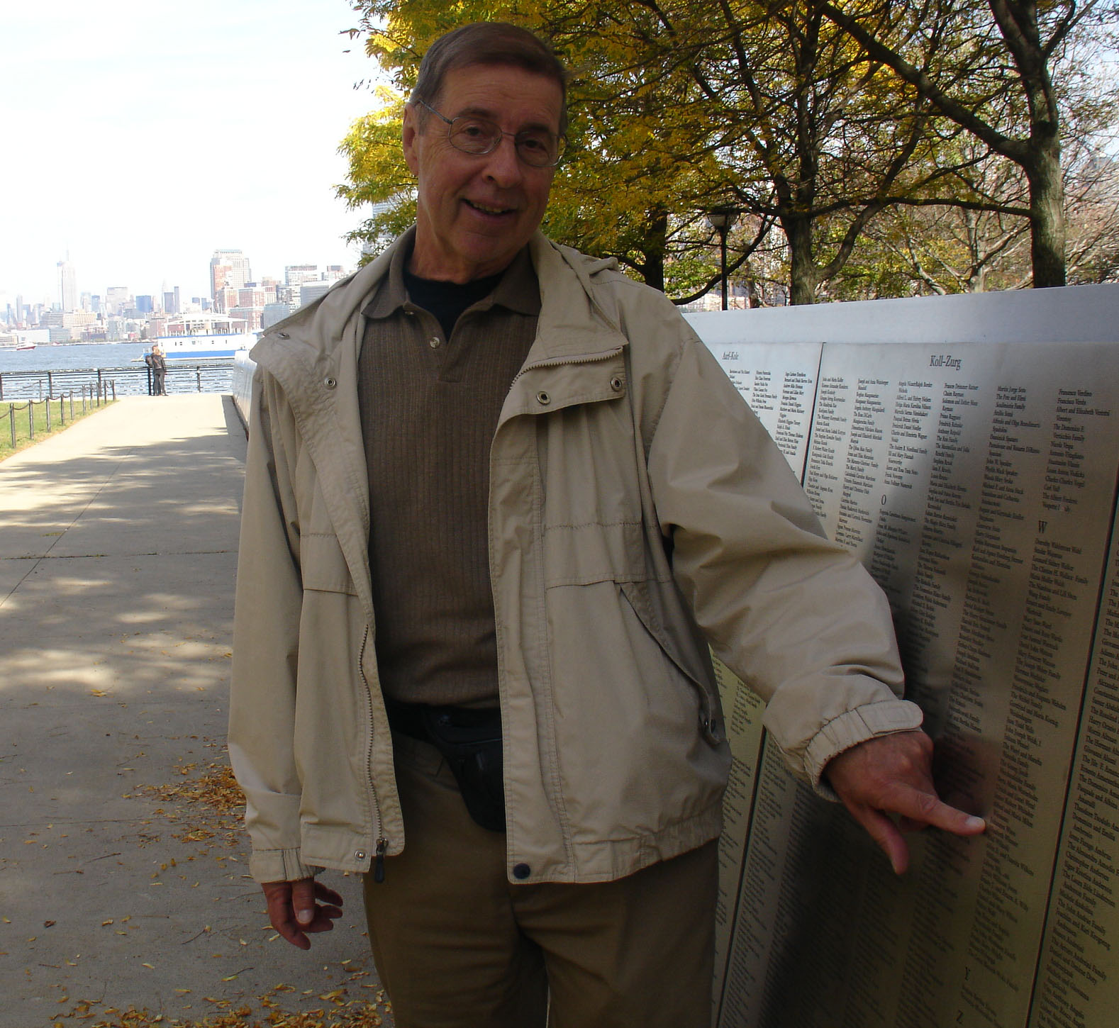 Willibald and Elisabeth's names are on large panels in the foreground. The World Trade Center in the background was destroyed on 9/11.