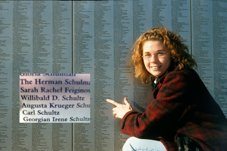 Amy (Schulte) Kutilek points out Willibald's name on the Immigrant Wall of Honor.